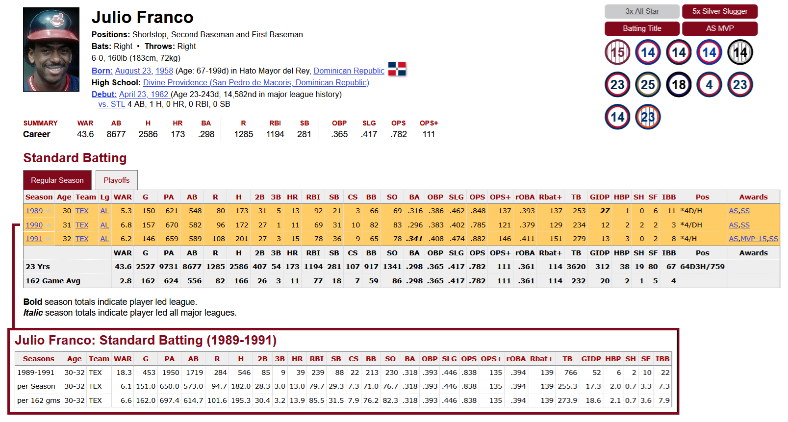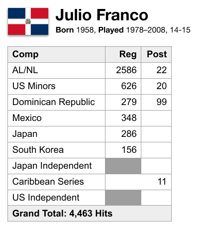 Including postseason play, Julio Franco recorded 2,608 hits in the American League and National League, 646 hits in the US minor leagues, 378 hits in the Dominican Republic, 348 hits in Mexico, 286 hits in Japan, 156 hits in South Korea, and he had 11 hits in the Caribbean Series.