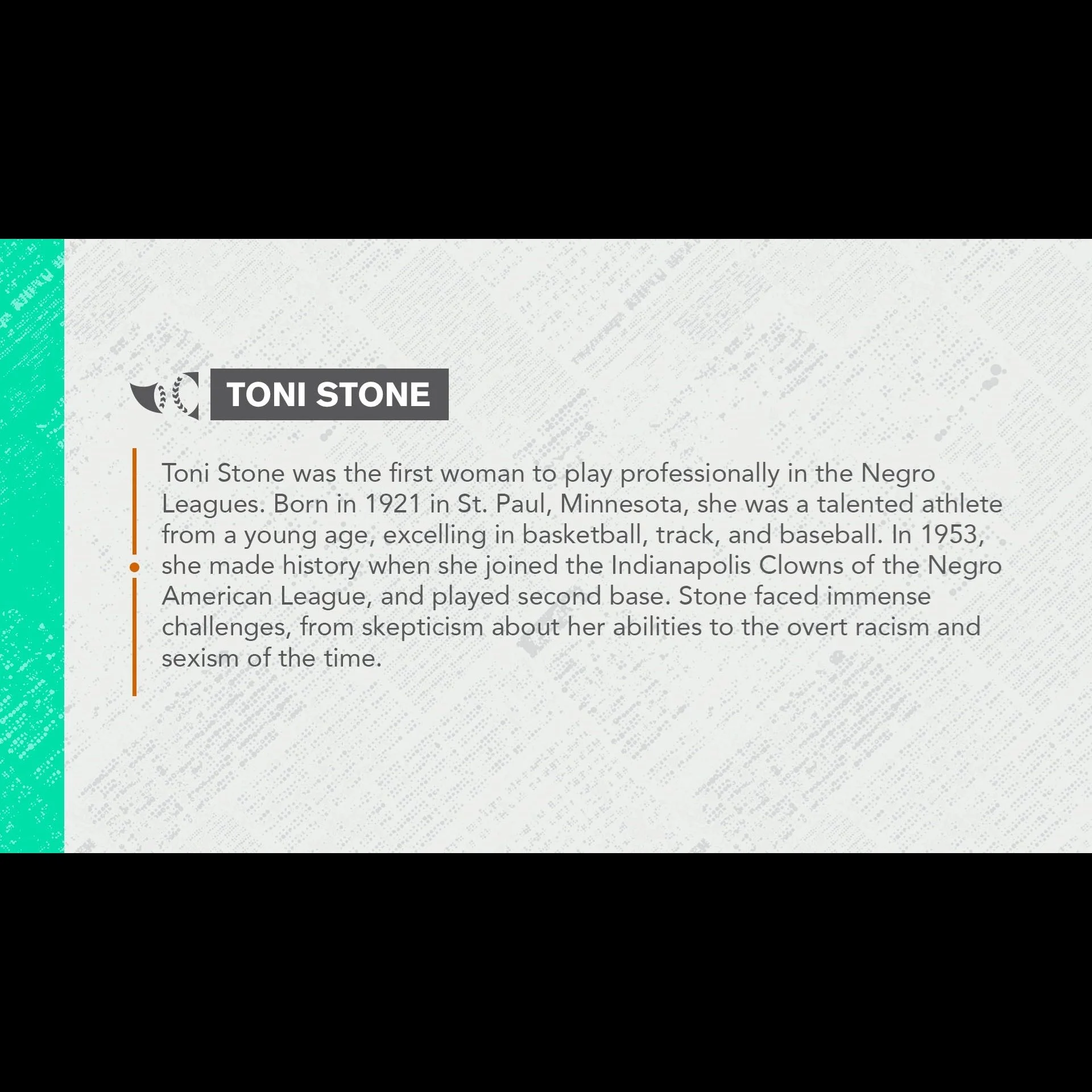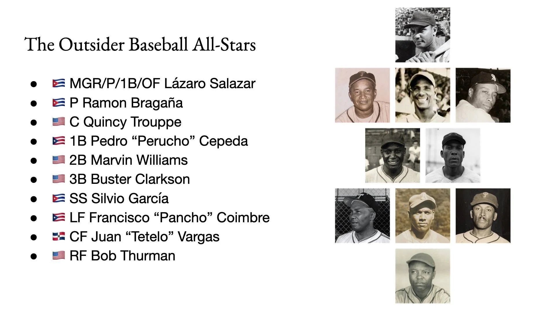 “It's also important to remember that the history of Black Baseball does not start in 1920 or end in 1948, and even from 1920 through 1948 our presentation is incomplete. There were hundreds of teams and thousands of players that make up a more complete and richer history of Black Baseball than we are able to present here, and from 1920 through 1948 there were many star players and teams that found it more feasible to play only a barnstorming schedule (not just in the United States, but also the Caribbean, Mexico, and Venezuela) rather than participate in leagues.”