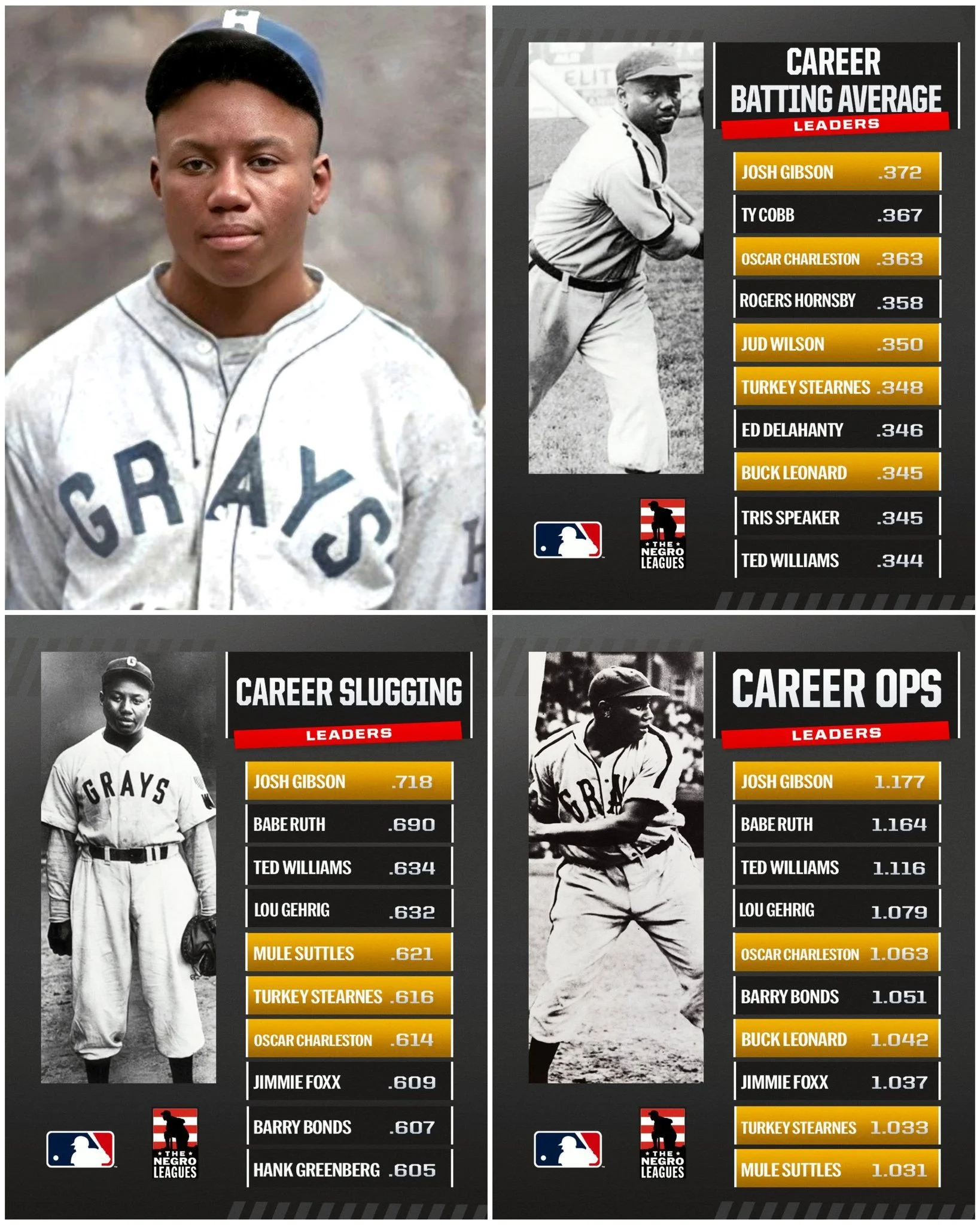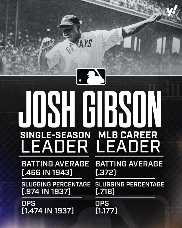 *These graphics were posted by the official social media accounts of Major League Baseball when the record books were initially officially integrated. As you can see, Josh Gibson is credited here with having a .718 career slugging percentage, but with this most recent update by MLB, his official record (at least, for now) drops to .717.