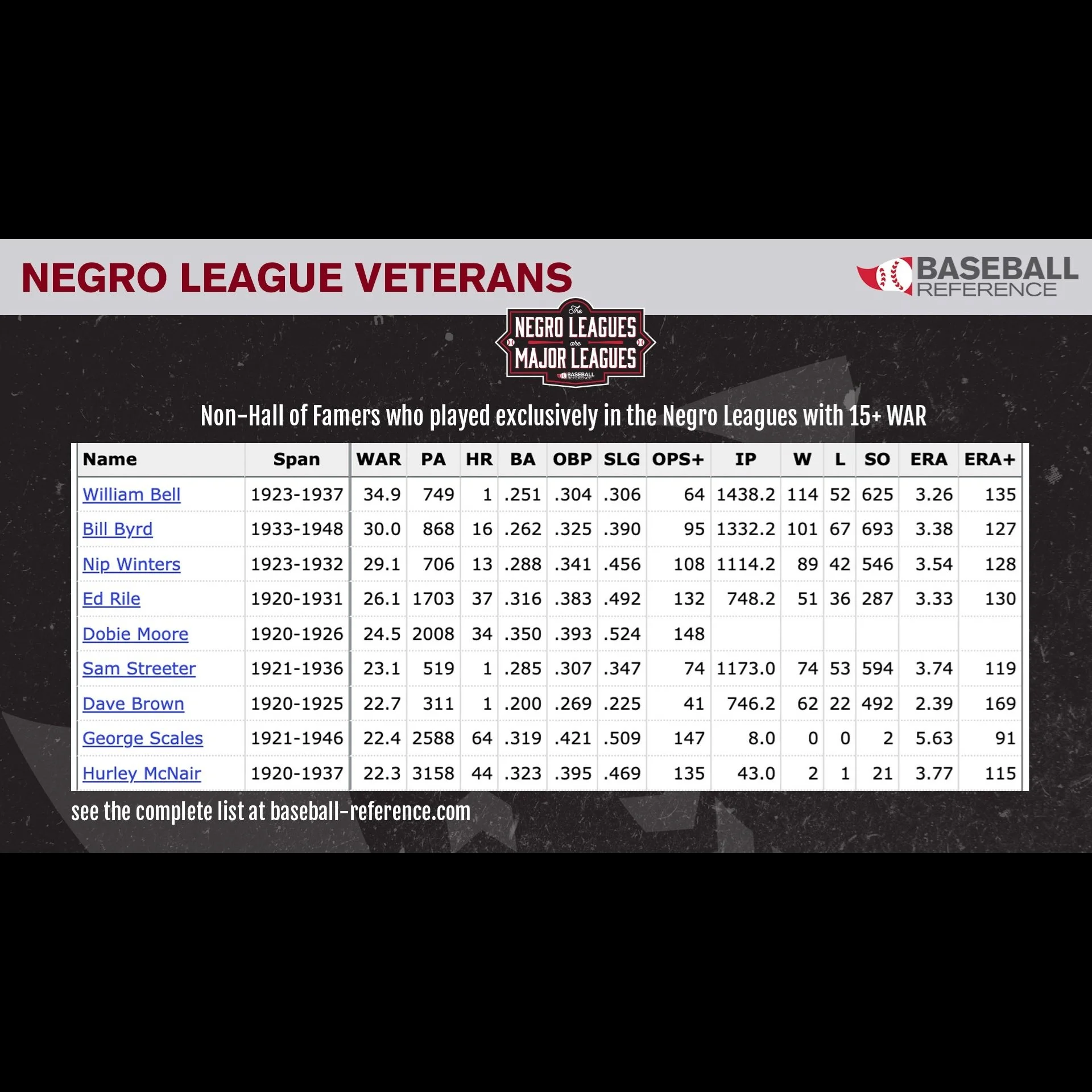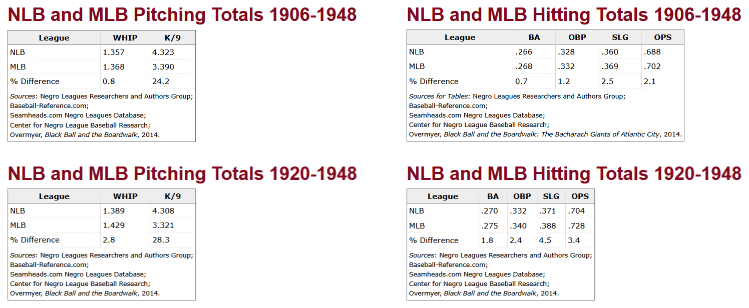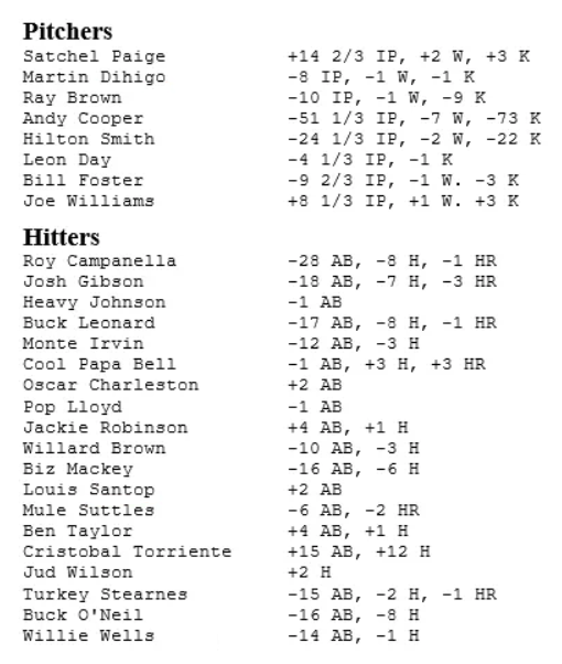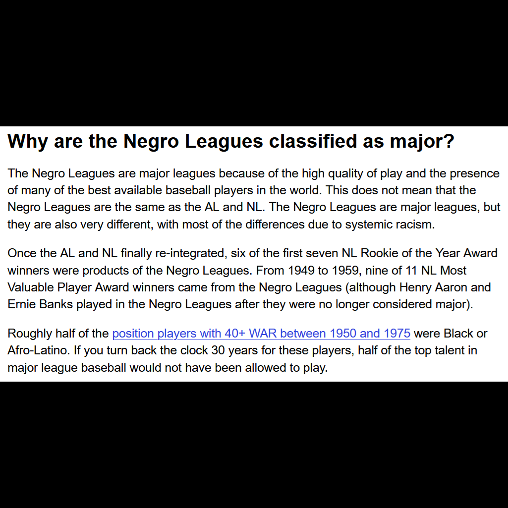 “Although our work is heavily stats driven, we recognize that the history and the legend and lore of many of these players exist beyond the numbers. The Negro Leagues data is not complete. While the quality of play in the Negro Leagues was on a major league level, the wages, travel, playing conditions, press coverage, and record-keeping were more varied, primarily due to systemic racism.