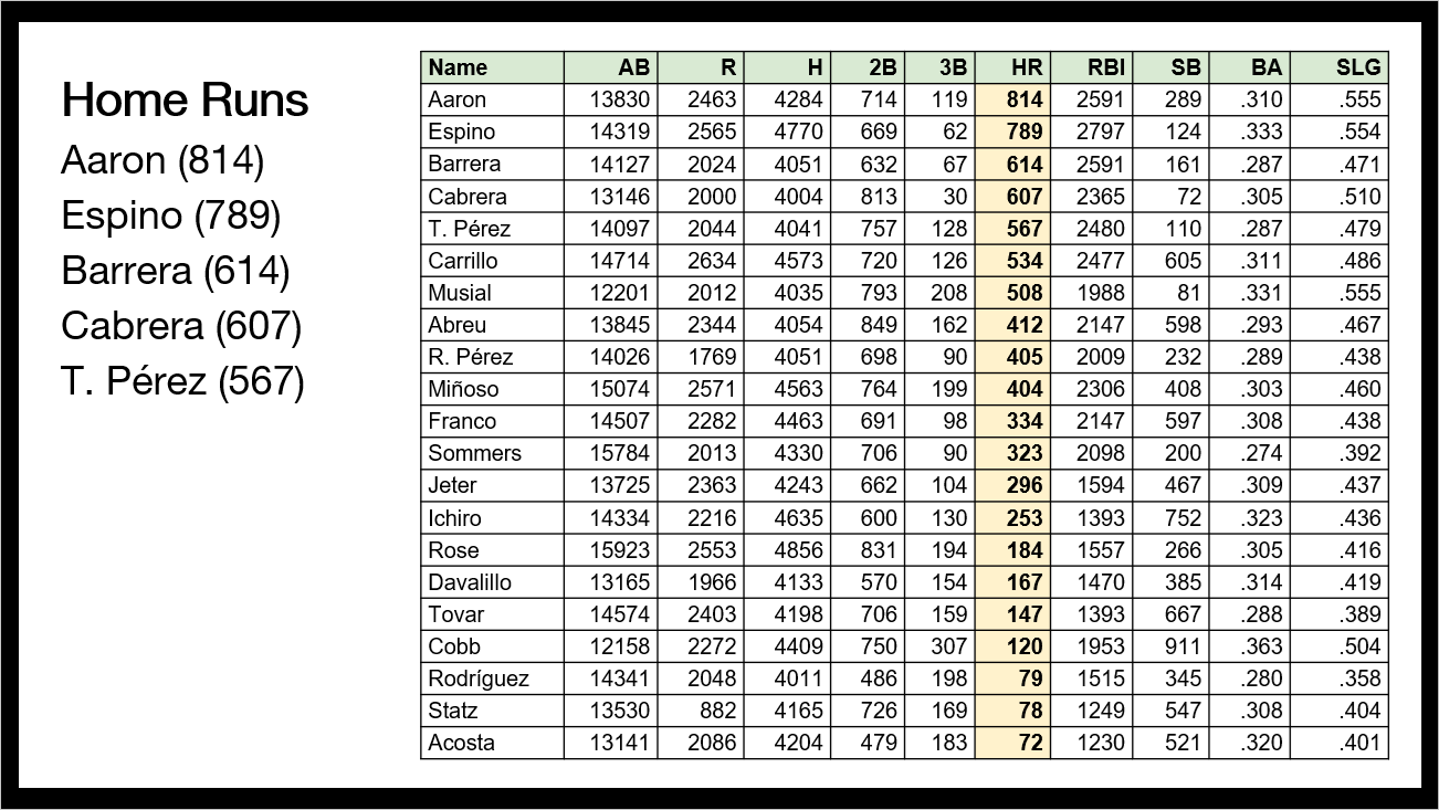 So, take that Henry Aaron anecdote and kick it up a notch. If you removed every home run Héctor Espino hit in his professional career, he would still have FOUR THOUSAND hits. 4,002, to be exact.