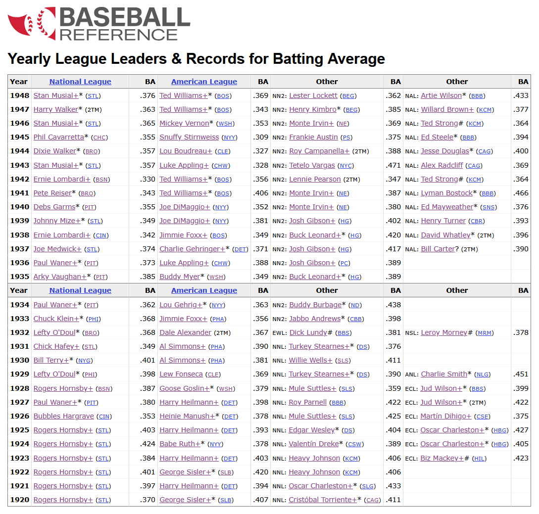 “In the years since Major League Baseball made their announcement, researchers have continued to scour the records for statistics that would reflect those Negro League seasons from 1920 through 1948. Periodically, Major League Baseball releases those findings into its dataset.”