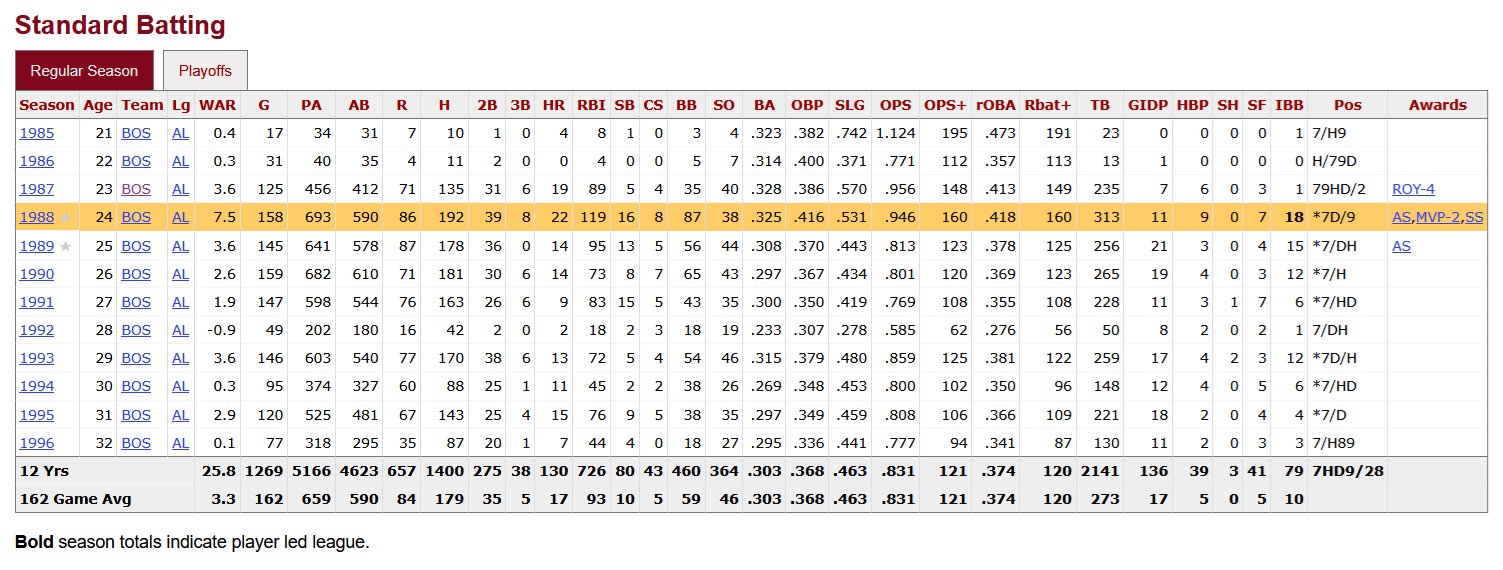Mike Greenwell’s career statistics, courtesy of Baseball-Reference.com, with his incredible 1988 season highlighted.