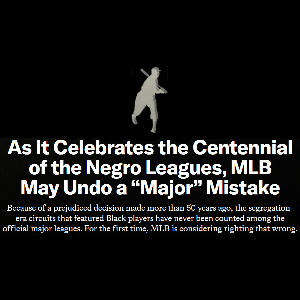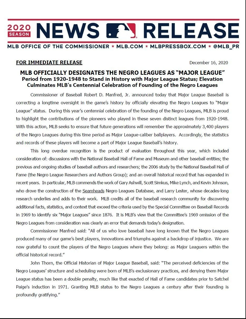 On December 16, 2020, Commissioner Rob Manfred announced that Major League Baseball would be “correcting a longtime oversight in the game’s history by officially elevating* the Negro Leagues to “Major League” status.”