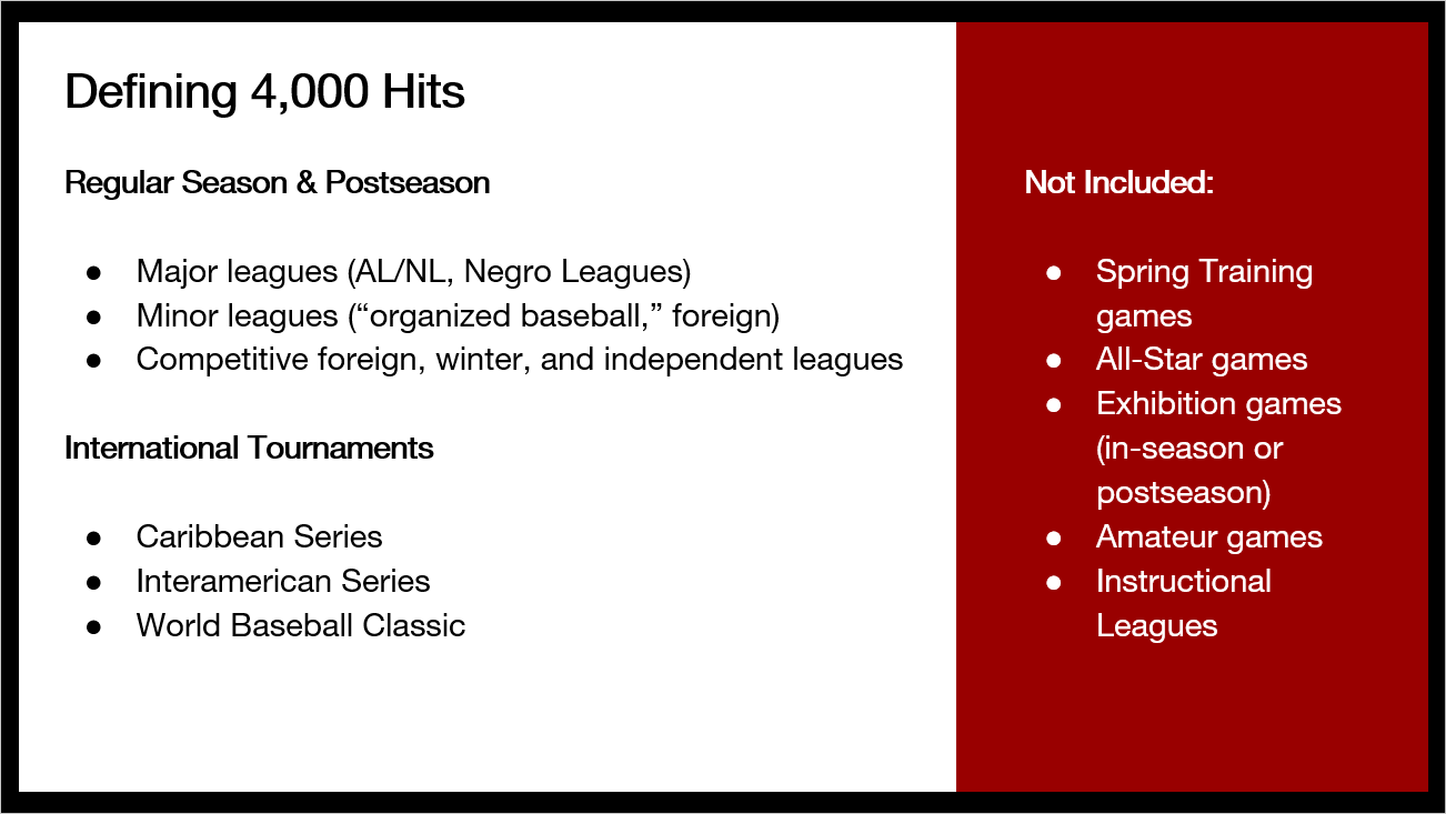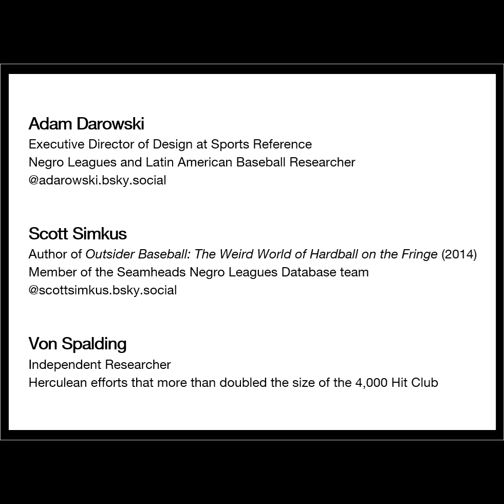 It all started when, in 2013, Scott Simkus published a SABR article announcing 9 members of the 4,000 career hit club. In February of 2025, after the Negro Leagues statistics had been incorporated thanks to the Seamheads data, and with Adam and Von adding their research, too, Scott published an update to his original SABR article which suddenly included 18 members of the 4,000 hit club, twice as many as he had found back in 2013.