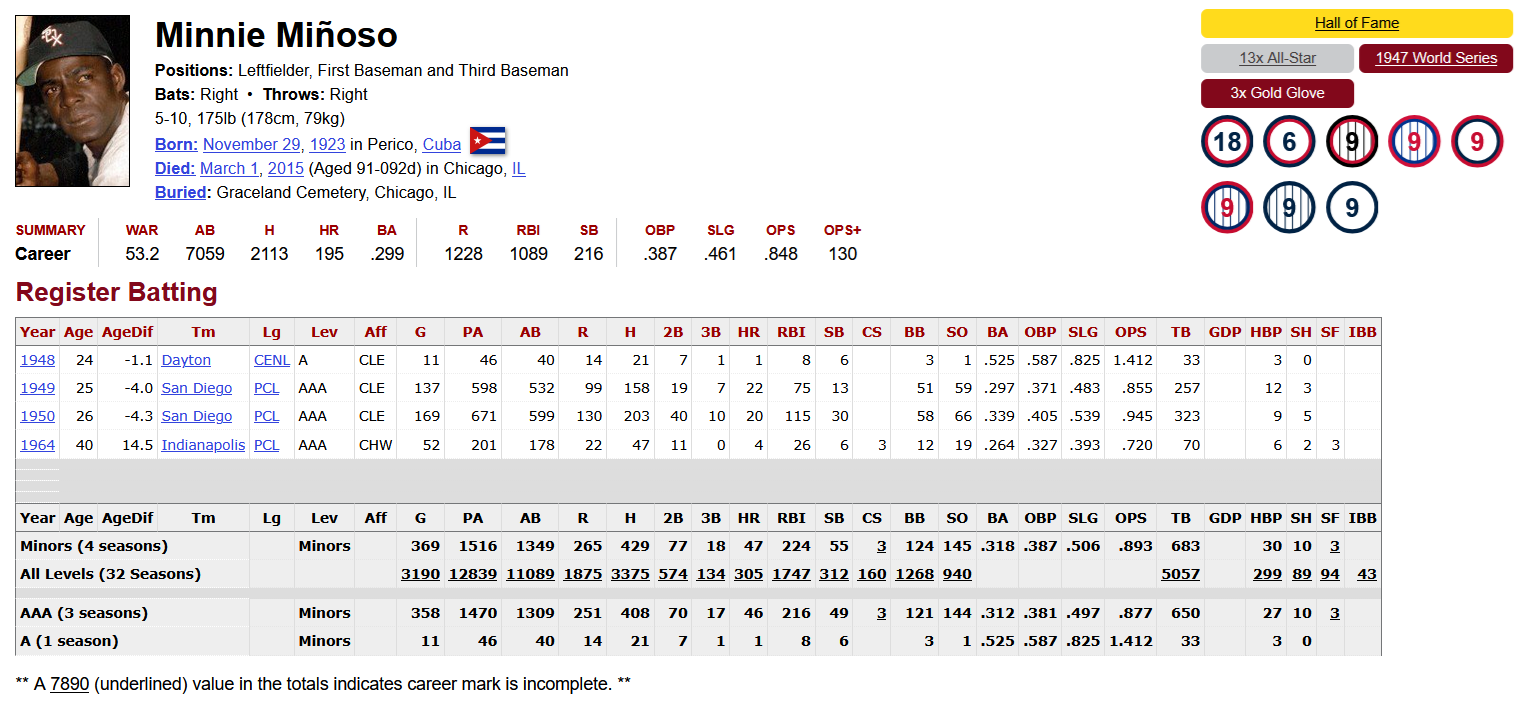 Anyway, back to the 4,000 Professional hit list… Ichiro is 3rd all-time with 4,635, Minnie Miñoso is 5th with 4,563, and Ty Cobb is 7th with 4,409, which includes what we believe to be his true, accurate Major League total of 4,189 hits, not the inflated 4,191 which is in many historical record books.